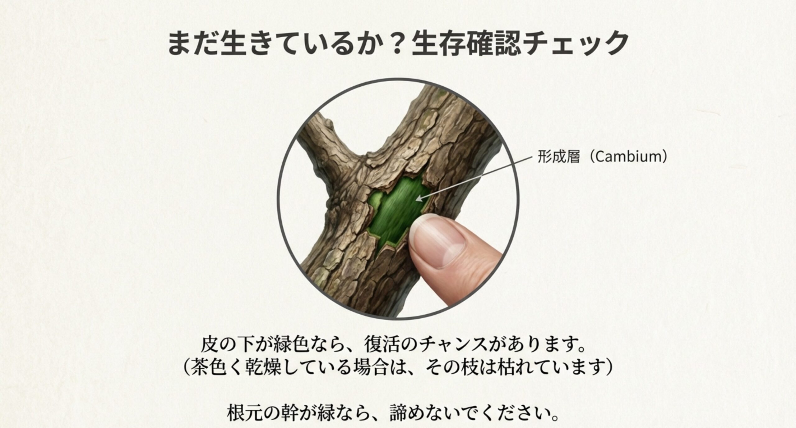 • 枝を少し削ったときに緑色の形成層が見えるか